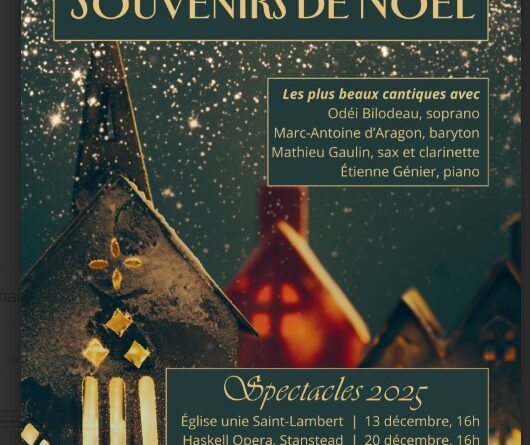 Les amateurs de musique classique ont rendez-vous le samedi 13 décembre, à 16 h, à l’Église unie de Saint-Lambert pour un concert de Noël réunissant la soprano Odéi Bilodeau et le baryton Marc-Antoine d’Aragon. Accompagnés du pianiste Étienne Génier et du saxophoniste Mathieu Gaulin, les artistes interpréteront les plus grands cantiques du temps des fêtes, de Minuit Chrétien à Have Yourself a Merry Christmas, en passant par Noël Blanc.